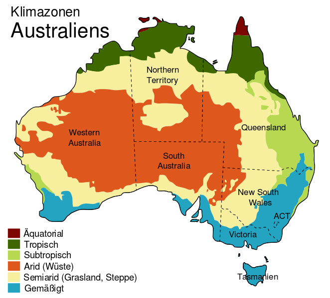 Karte Klimazonen Australien: Australia-climate-map_MJC01_1.svg: NobletripeAustralia-climate-map_MJC01_1.svg: Grillothis file: Furfur, CC BY-SA 4.0, via Wikimedia Commons